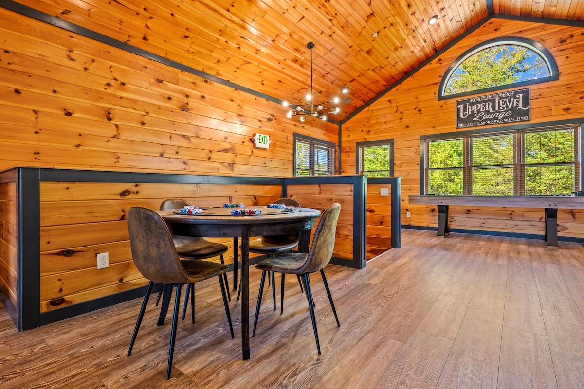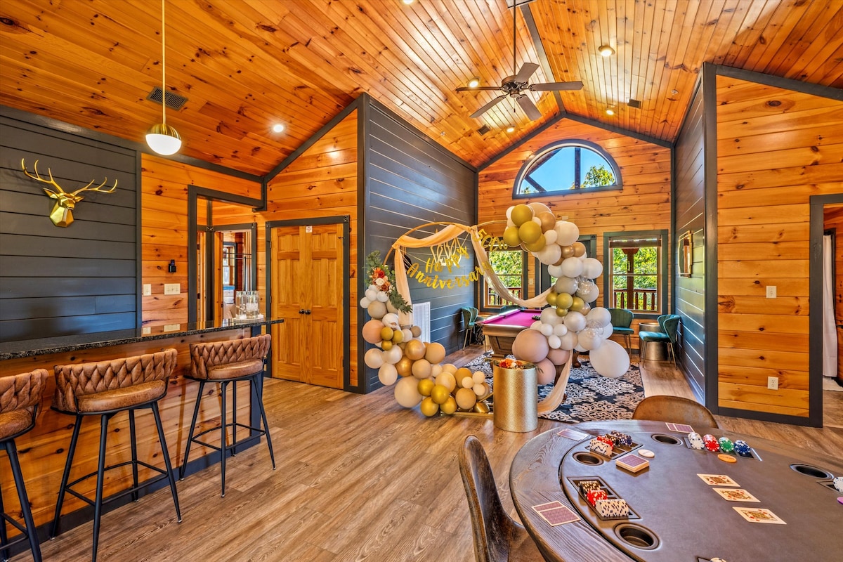 Step inside and discover a haven of rustic modern elegance, perfect for bringing your loved ones together. Laughter fills the expansive lounge, where a stylish bar, pool table, shuffleboard, foosball, arcade games, and a poker table ignite friendly and spirited competition.