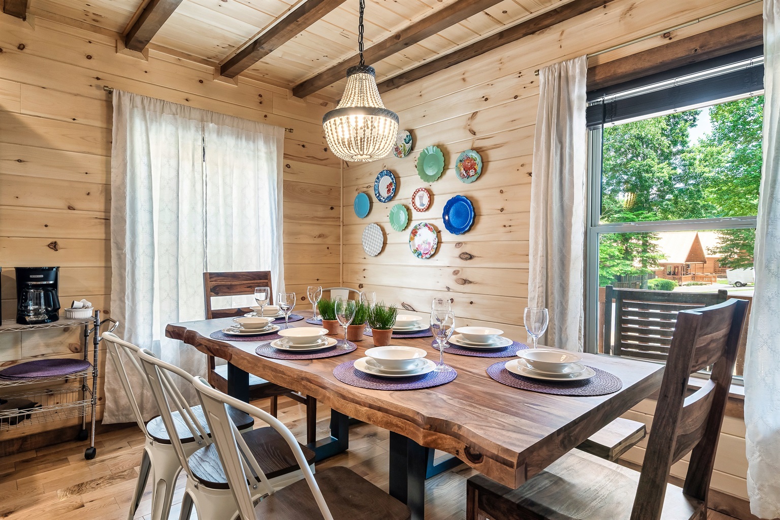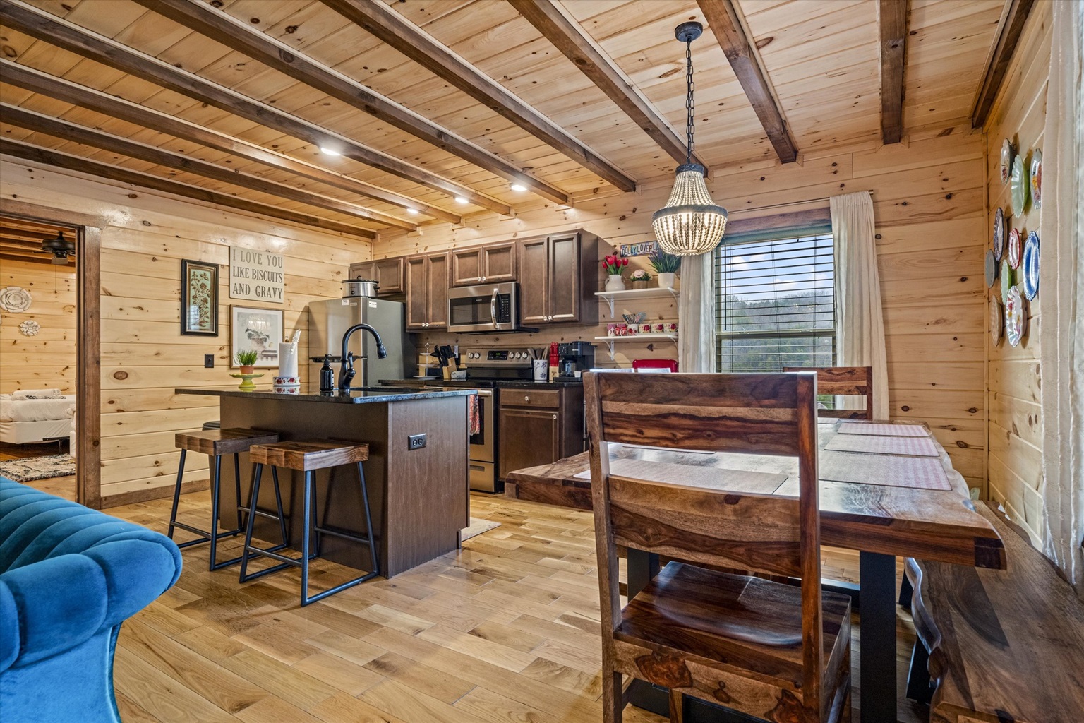When you’re ready to enjoy a meal, you’ll be able to make use of the stylish wooden dining table under an elegant chandelier, which overlooks the beautiful landscape surrounding the cabin. Dinner with a view, every night of your stay! There’s plenty of space at the table for eight people, plus additional seating at the kitchen island.