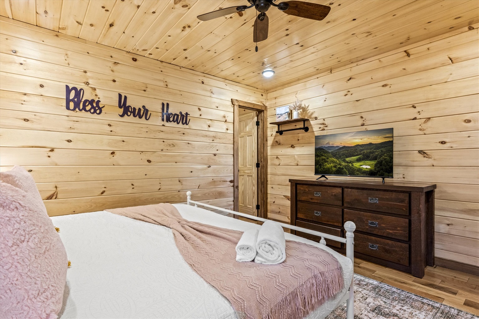 Every bedroom in the “Southern Belle” is spacious and uniquely decorated with your comfort in mind. Rest assured that you’ll get a good night’s sleep after a busy day of exploring the local attractions. A total of six beds are on offer throughout this entire cabin, giving you the maximum flexibility in sleeping arrangements to suit your family’s needs.