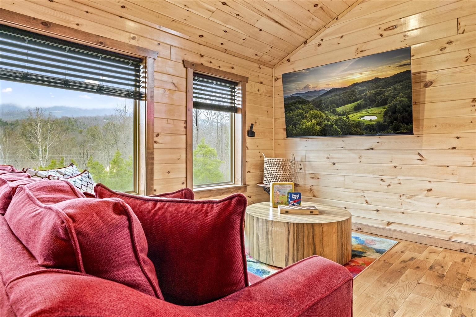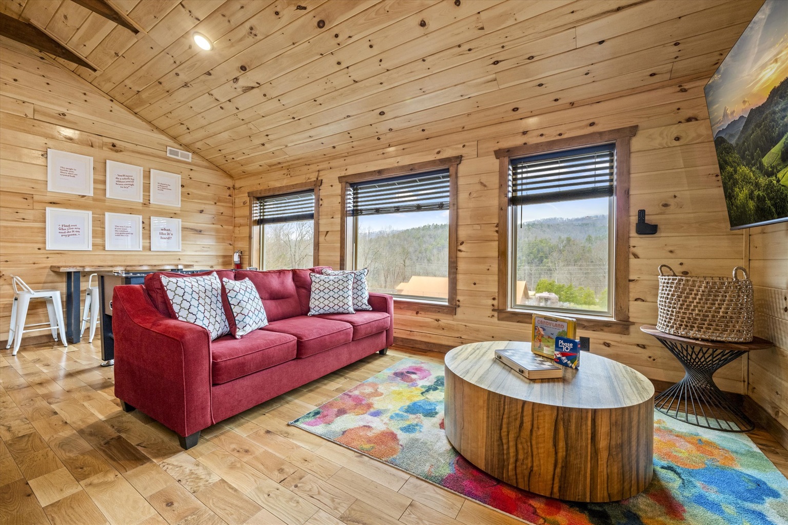 After dinner, spend the evenings curled up on the stylish velvet couch, flip the switch on the indoor gas fireplace, and enjoy a favorite family movie on the large flat-screen TV. The stunning mural tribute to the great Dolly Parton is the perfect backdrop for a selfie or group photo to capture your holiday memories.